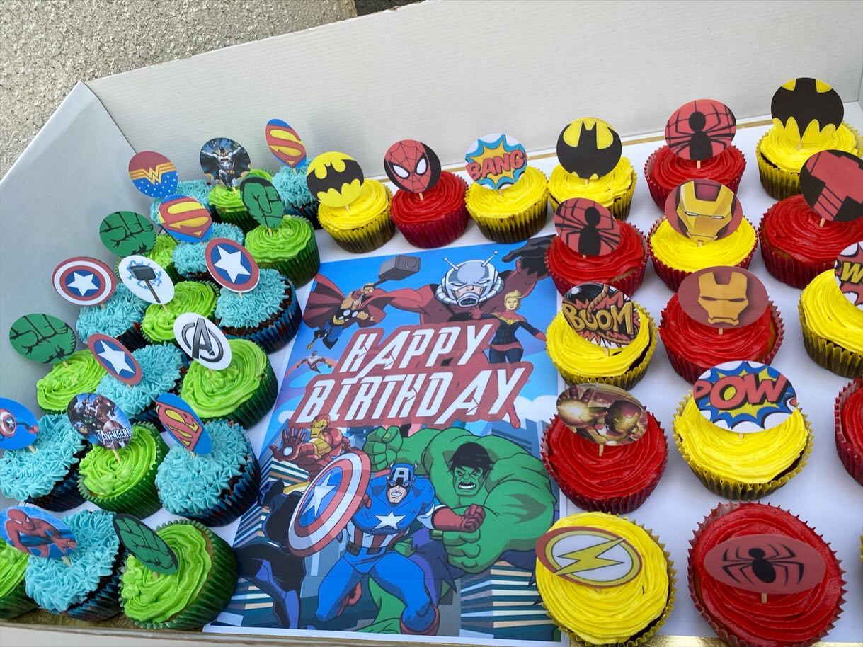 36 pieces of cupcake, a mix between vanilla and chocolate flavors, cream frosting on top, Avengers toppers and a printed Birthday photo in the middle.